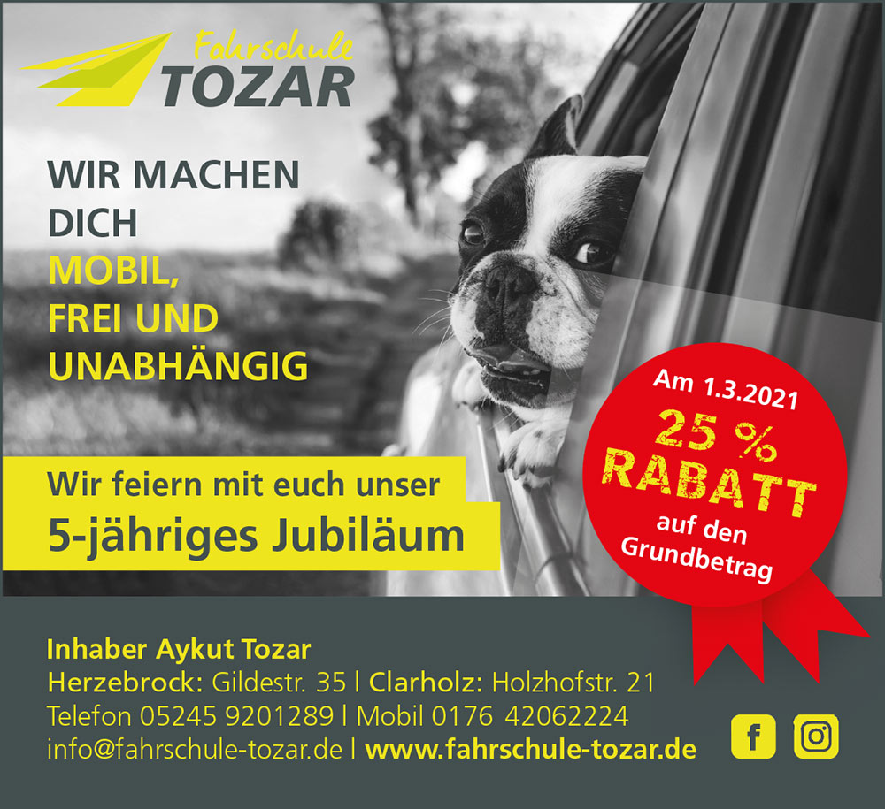 Grund für dieses besondere Angebot ist das 5-jährige Bestehen der Fahrschule Tozar. Am 01.März 2016 wagte Aykut Tozar, bis dato Berufskraftfahrer im Personennahverkehr sowie seit 2011 angestellter Fahrlehrer, den Sprung in die Selbständigkeit und eröffnete an der Uthofstraße 5 im Ortsteil Herzebrock seine Fahrschule. Seitdem begleitete die Fahrschule Tozar ca. 1.100 Fahranfänger mit viel Erfahrung und Kompetenz erfolgreich durch Theorie und Praxis bis hin zur erfolgreich bestandenen Fahrerlaubnis.